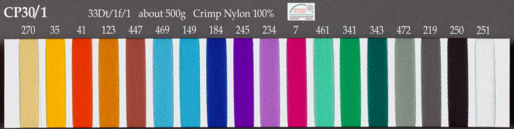 We use irregular cross-section monofilament nylon yarn and apply crimping, unlike the straight MF series. The colorfastness is stable, similar to the MF series, and the yarn has the characteristic of crimping, creating a spring-like twist. Fabrics made with this yarn exhibit a unique luster and distinct texture due to the irregular cross-section, providing a sense of unevenness. When used in a single color, it results in a clear hue, but when different colors of CP30/1 are combined, it creates a fabric with a complex and subdued expression.